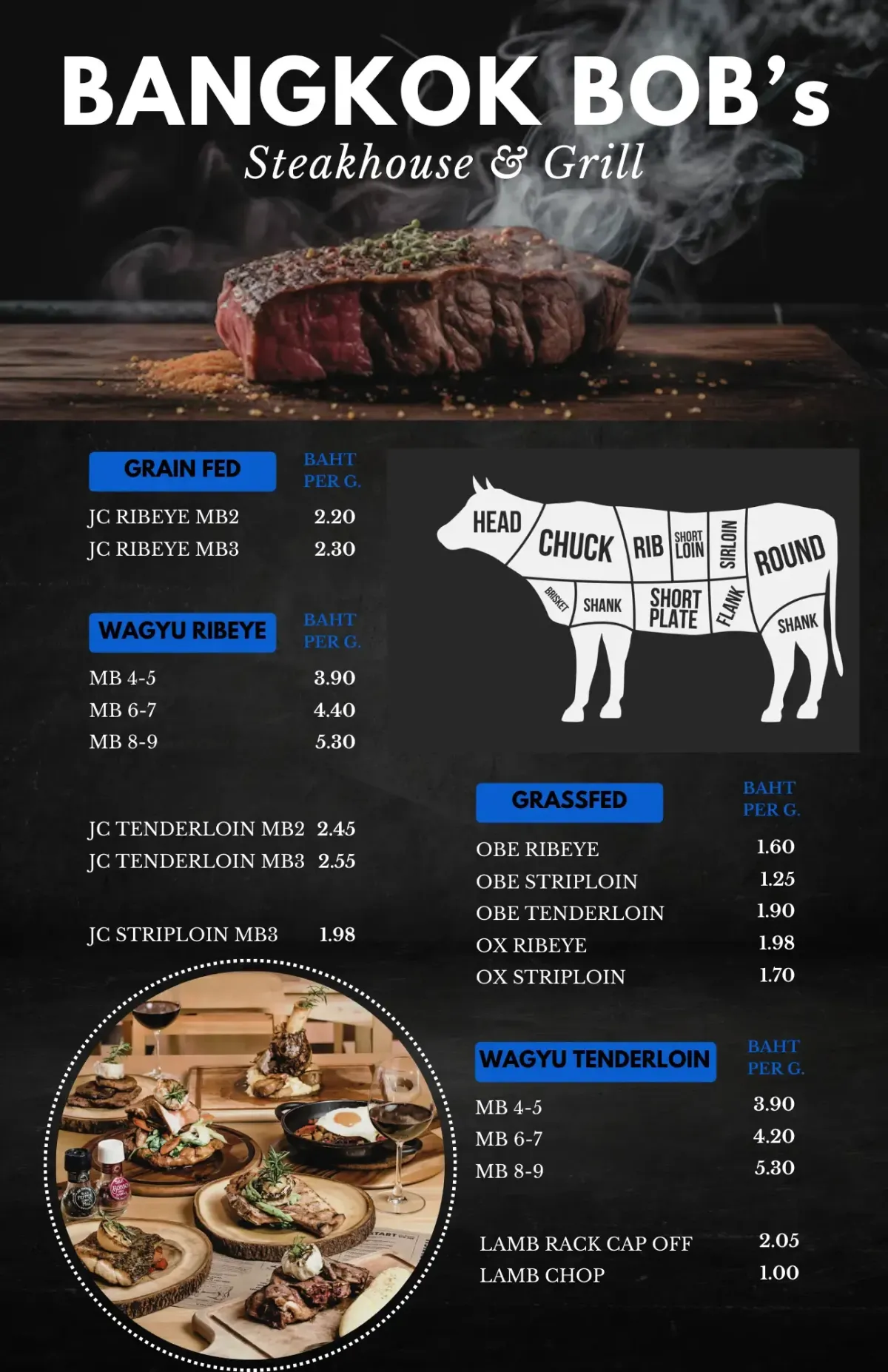 Meet our secret weapon: we exclusively cook and use the unbeatable functions of world’s best oven grill, the Josper Charcoal Oven, professional chefs’ favourite for steak perfection. This method delivers the smoky flavour, charred texture, tenderness, and juiciness Bangkok Bob’s is known for.