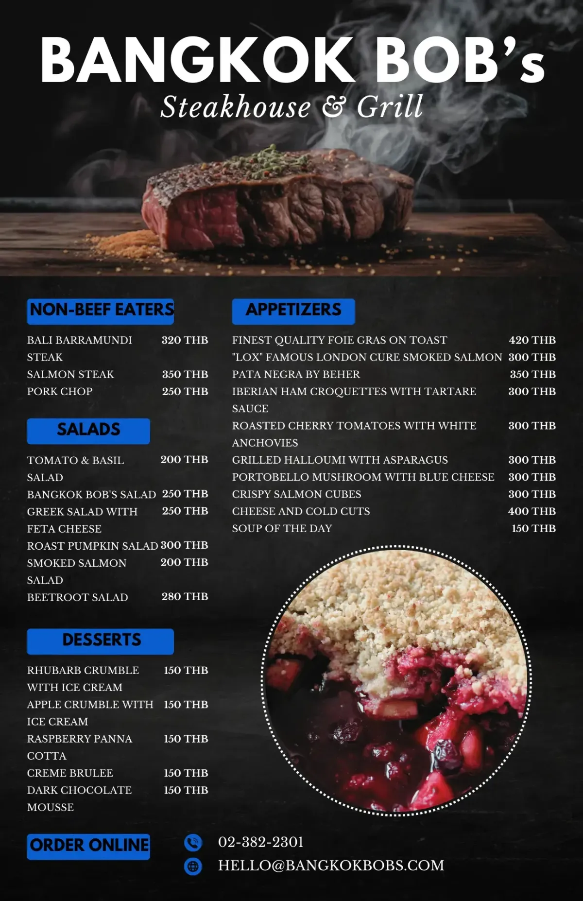 Join us daily at Bangkok Bob’s Steakhouse, Sukhumvit 71, for a hearty lunch or a full-course dinner with your favourite drinks.